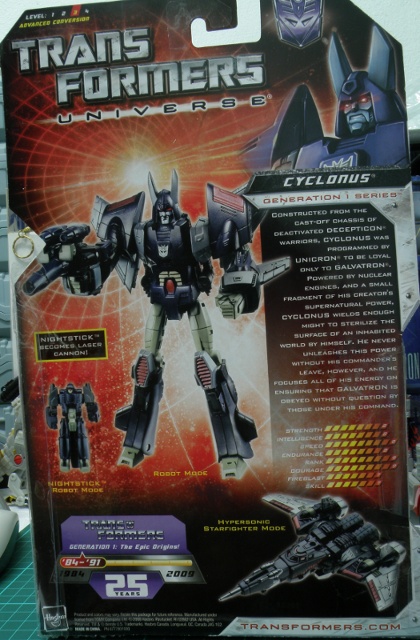 The back of the card has bio and statictics of Cyclonus it features a shot of the actual toy in robot mode.