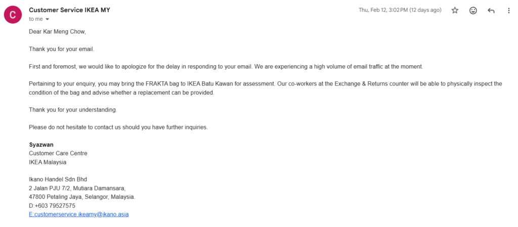 An email was first sent to Customer Service IKEA MY. The reply is promising, as long as I can bring the damage the Frakta to Ikea, the support and return staff shall make accessment to determine extend of the damage to evaluate if 1 to 1 exchange is possible.