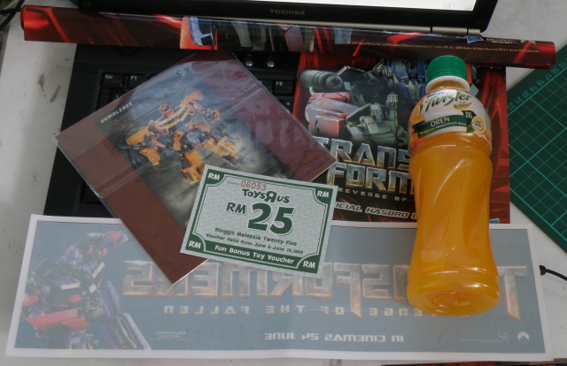 The semi-exclusive gift: A poster of Optimus prime, a car sticker of optimus prime, a car sticker of Autobot Insignia, a new Hasbro catalog, a RM25 voucher valid from 8th June till 28th June 2009 and a bottle of orange juice. From my point of view it looks more like promotional and marketting materials hehe. Voucher to encourage spending ๐ and orange juice as a modest thank you ๐